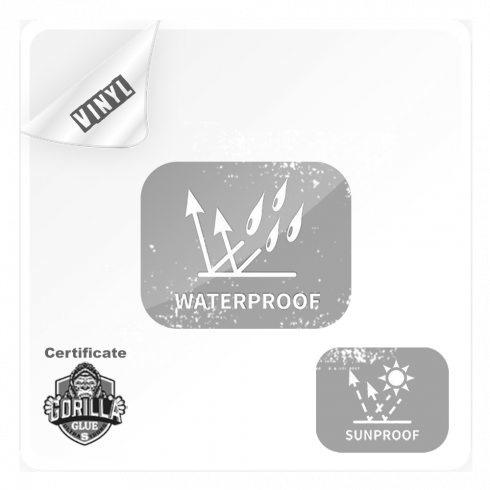 Premium white PP foil with highly permanent Gorilla Glue with 100% UV and Waterproof protection. 8 x more thick than a normal sticker and then covered with an ultra-sticky glue that is twice as thick as our normal glue and twice as tall (meaning it sticks to almost anything)